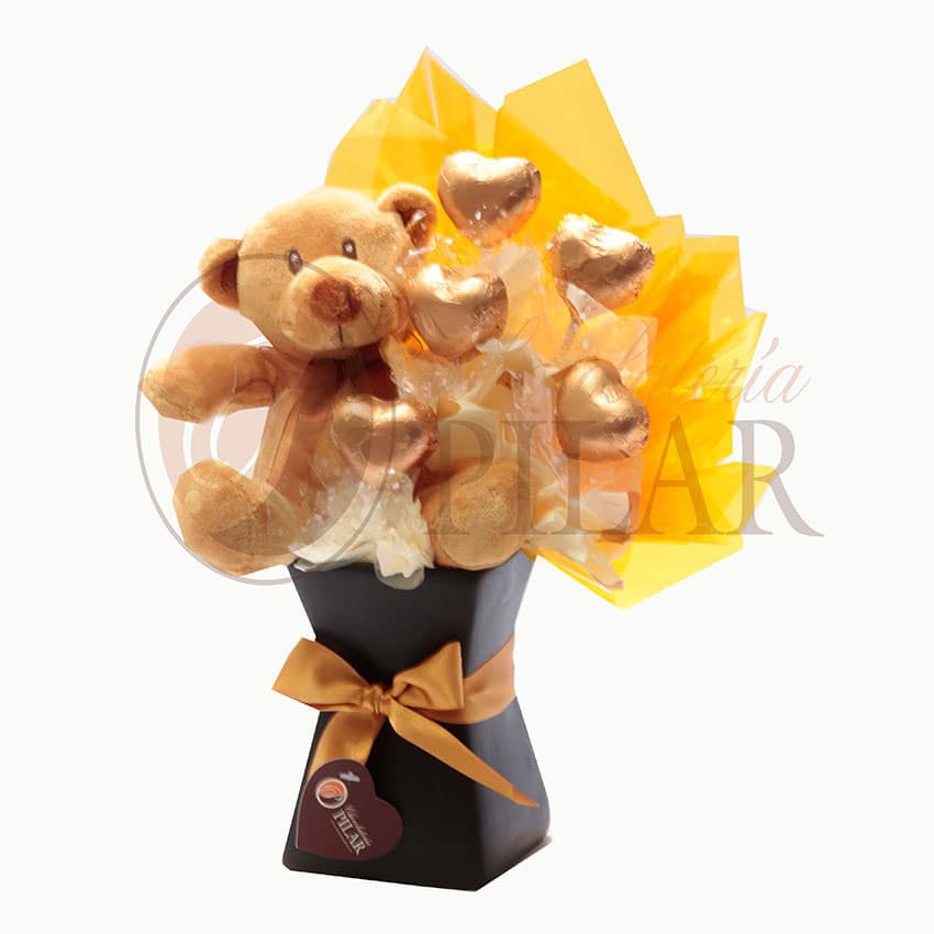El arreglo consta de 05 paletas en forma de corazón rellenos de trufa elaborado en chocolate real mínimo 57% cacao, forrados en platina + peluche.