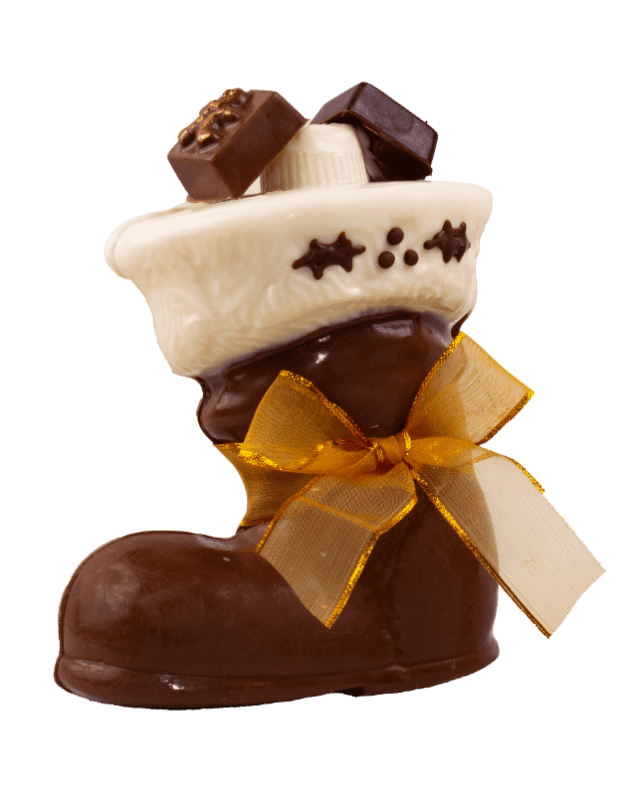 Figura de Chocolate, elaborado con chocolate blanco y chocolate 57% Cacao. Lleva bombones de chocolate en sabores surtidos.