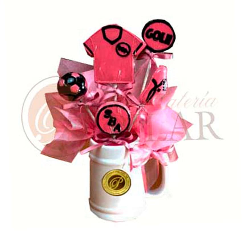 Taza cerámica equipo de futbol boys con escudo del equipo, consta de 4 paletas de chocolate, hechos en forma artesanal pintados a mano con cobertura blanca y rellenos de trufa y chocolate real 57% de cacao.
